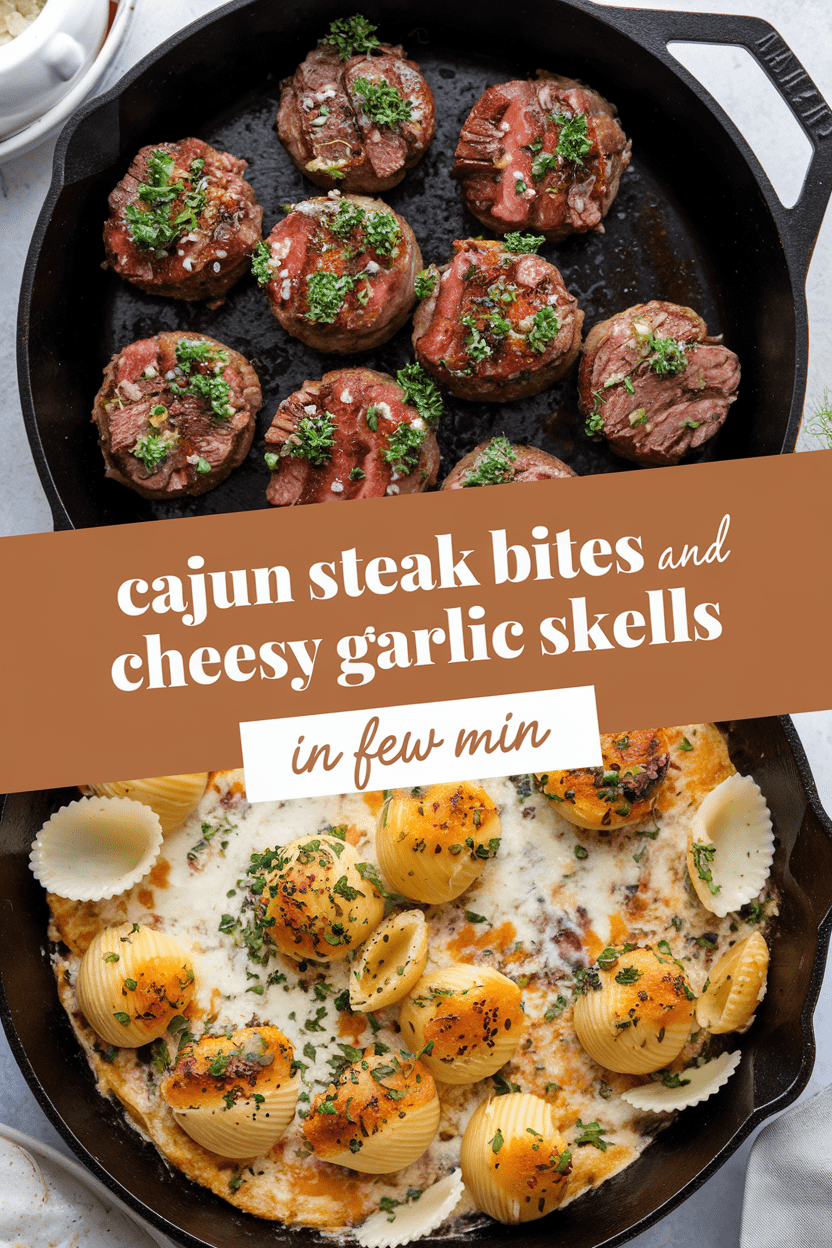 Cajun Steak Bites and Cheesy Garlic Shells Skillet