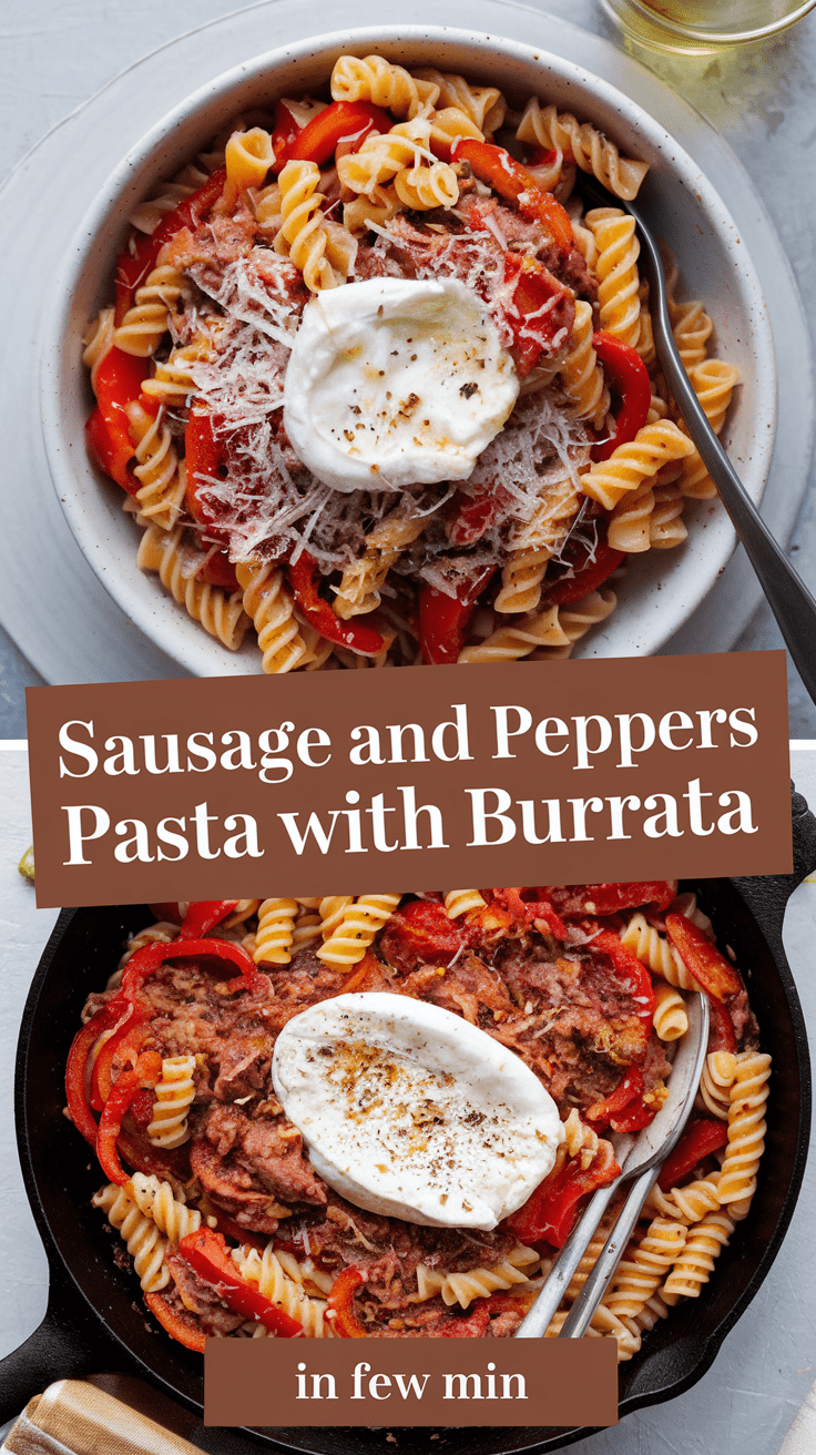 minutesSausage Pasta with Burrata is a flavor-bursting Italian-inspired pasta dish with juicy sausage, sautéed bell pepper, and garlic tossed together with some light tomato sauce and pasta. Finally, just before plating, the creamy burrata comes on top, the warmth causing it to slowly melt into the pasta for utter luxe with every mouthful. The sweet peppers offset the flavor of the savory sausage, while the burrata makes the dish feel dreamy and excessive.